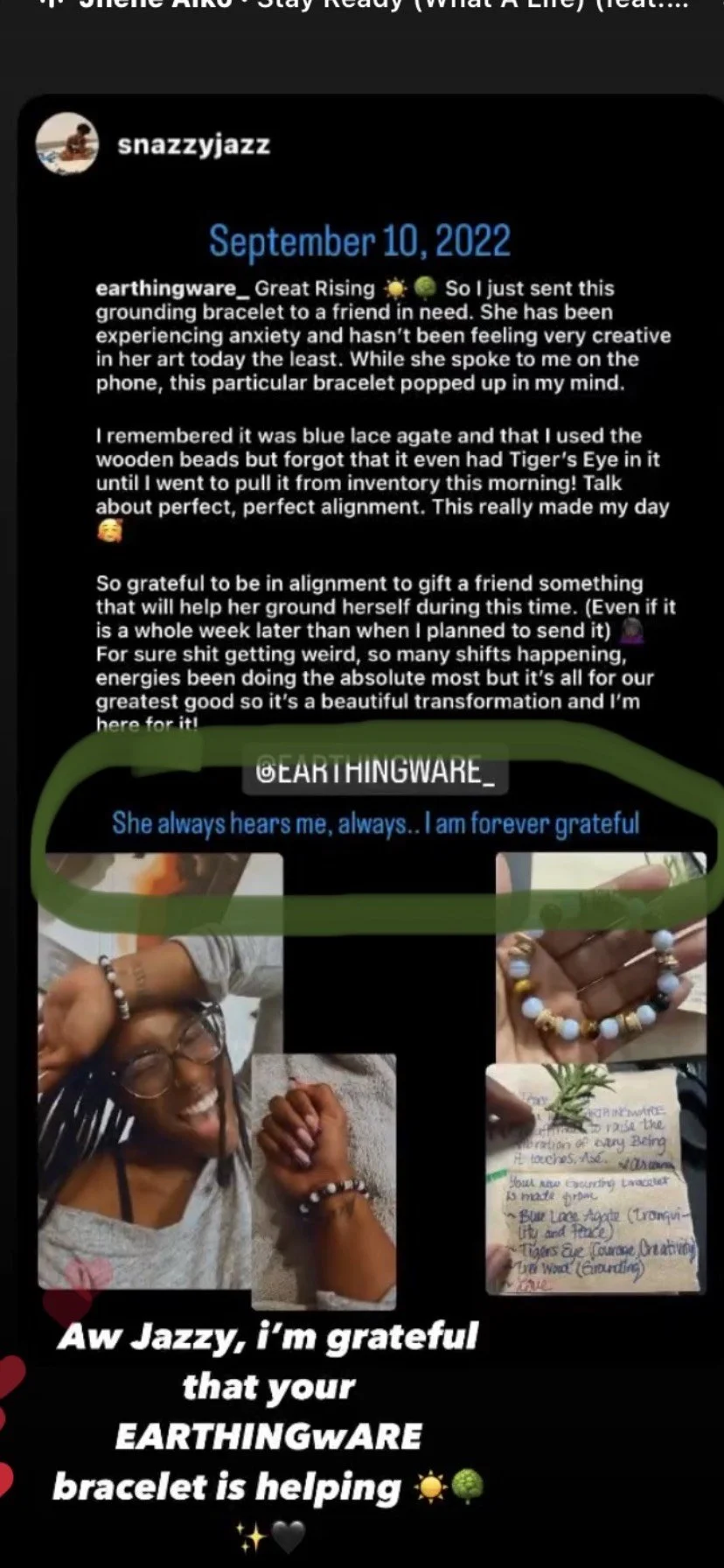 - Jazzy after receiving a surprise EARTHINGwARE bracelet to assist with her grounding needs following a phone consultation